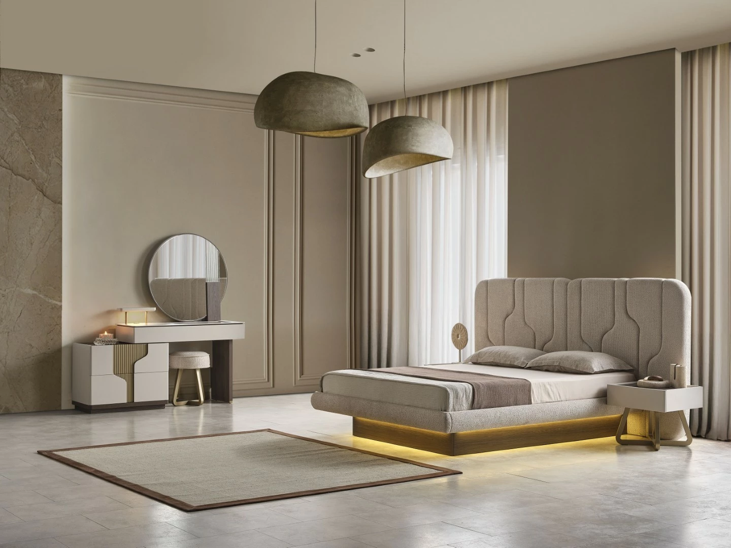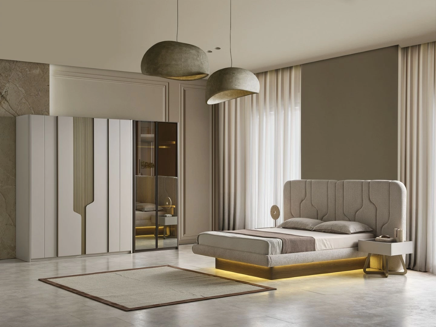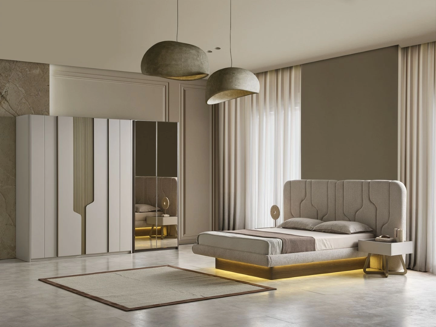 Yatak odası takımı, rahat ve kaliteli bir uyku deneyimi için tasarlanmıştır. Geniş ve konforlu yatak, yatak başlığı ve şık gece lambaları ile huzurlu bir uyku ortamı sağlar. Yatak odasında vakit geçirirken konforunuz en ön planda tutulmuştur.